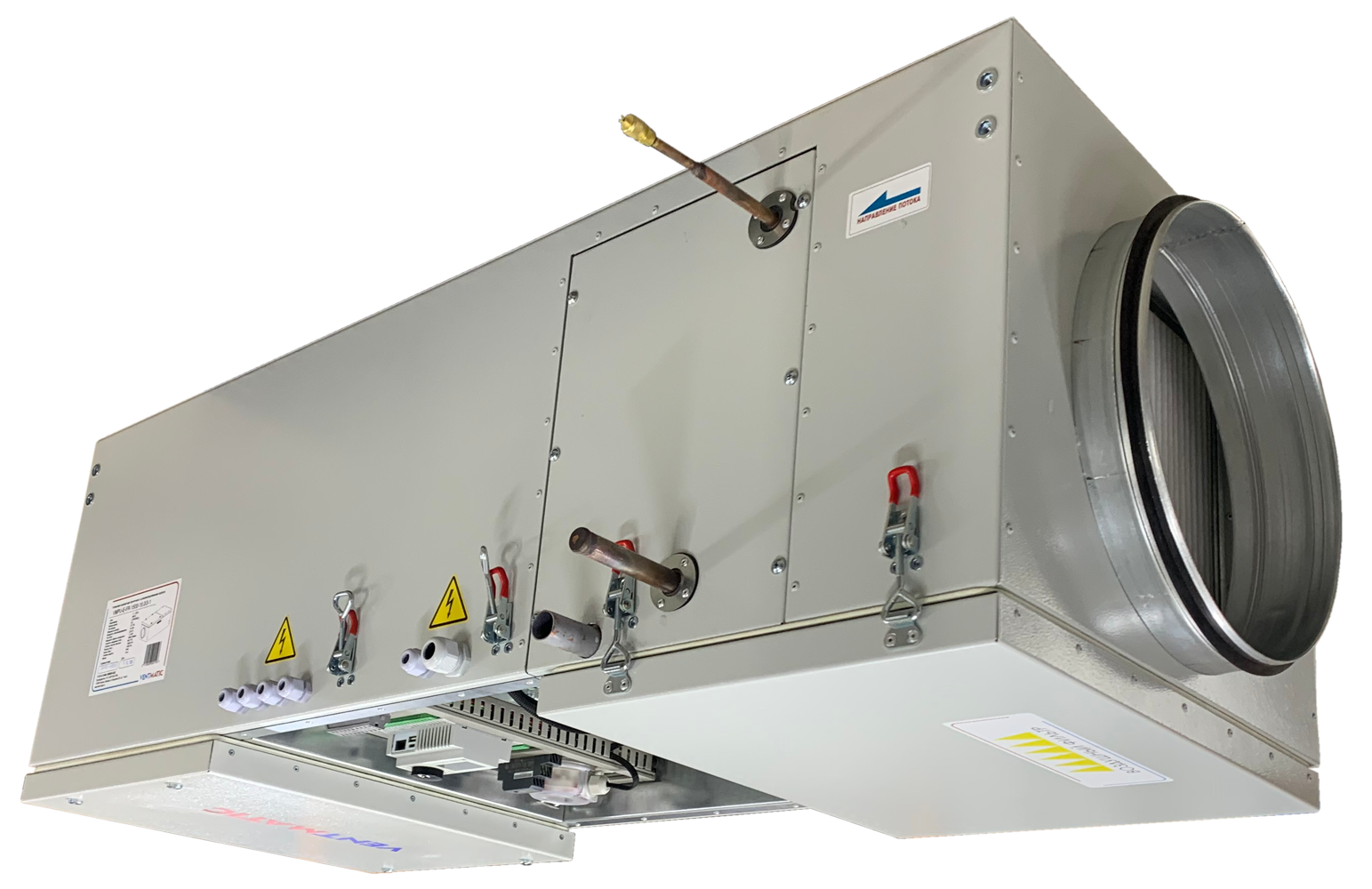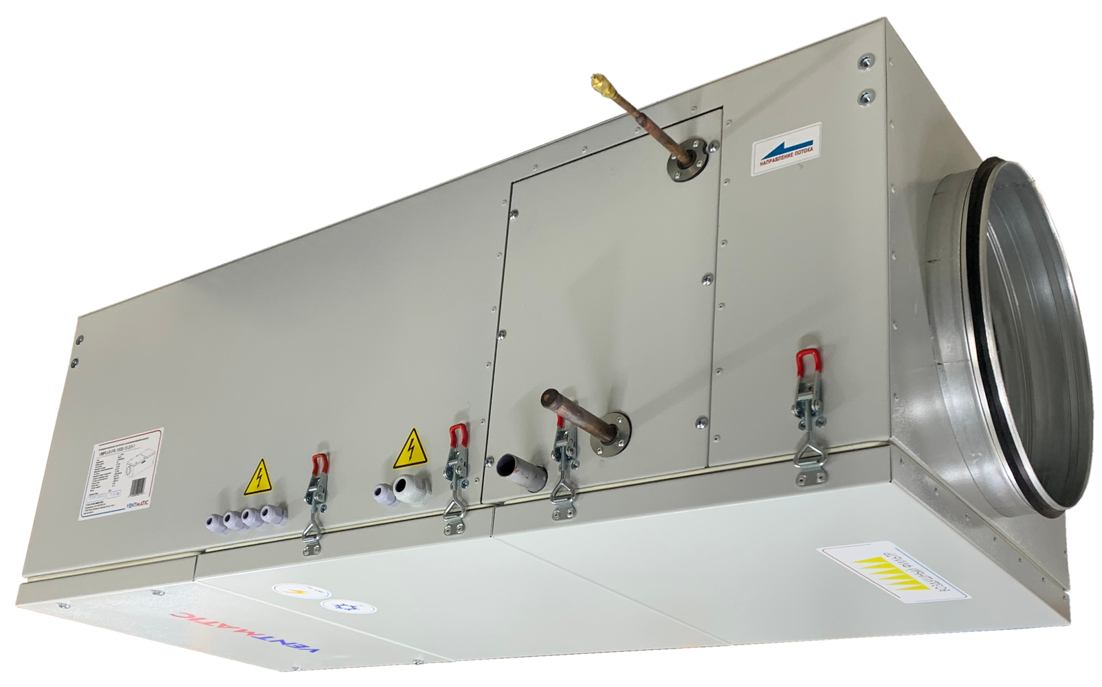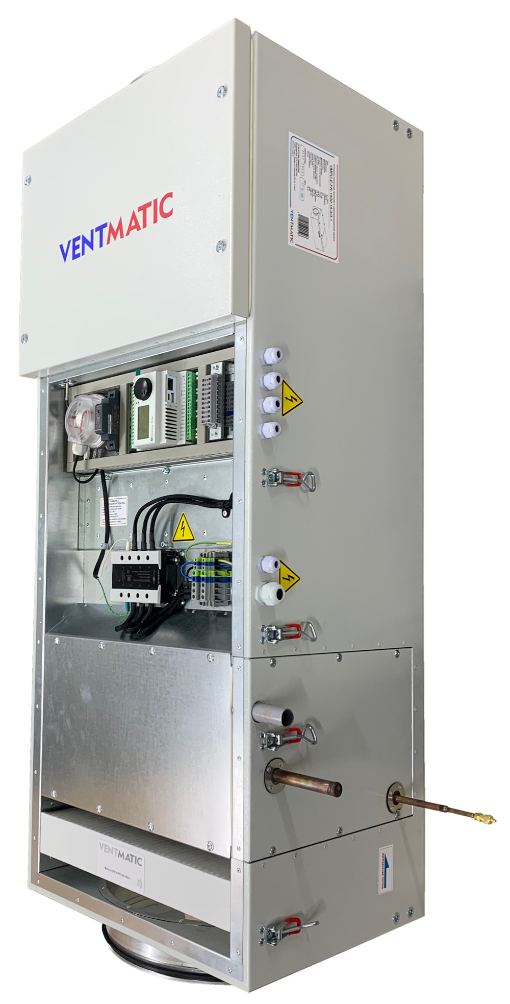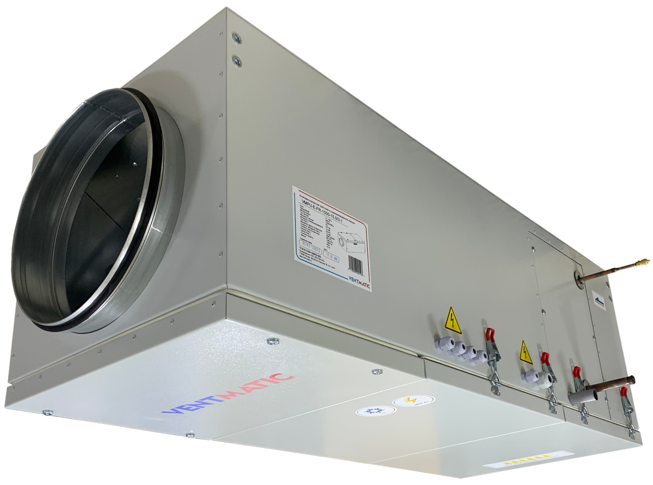 Серия VMPU-E-FR-1 приточных установок с электрическим нагревом и фреоновым охлаждением в шумоизолированном корпусе VENTMATIC представлена в 4 типоразмерах: