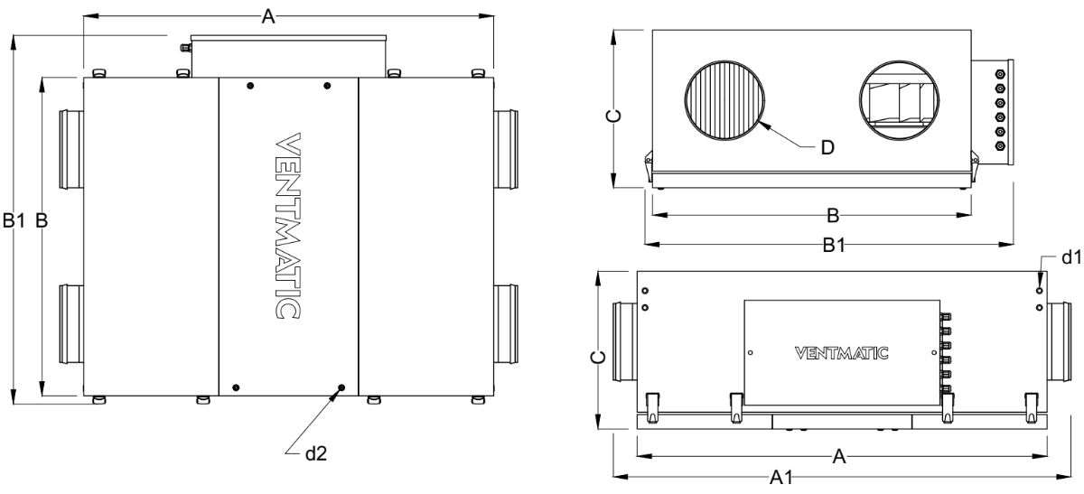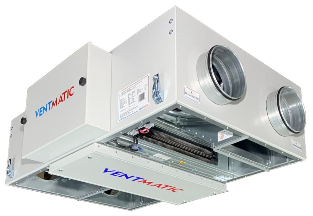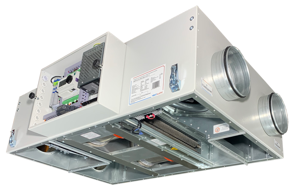 Серия VMPVU-E-RR подвесных приточно-вытяжных установок роторным рекуператором и электрическим нагревом в шумоизолированном корпусе VENTMATIC представлена в 5-х типоразмерах: